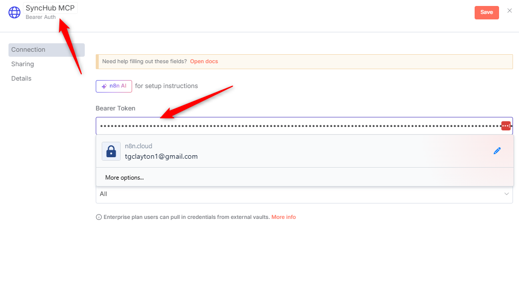 Add a new credential in the Credential for Bearer Auth dropdown. In the new credential configuration window name the credential "SyncHub MCP" then paste your saved third party integration token into the Bearer Token box and save: