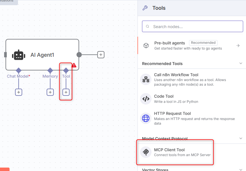 Once you have your token add an AI Agent node to your workflow and click the Tool button. Select MCP Client Tool from the options list: