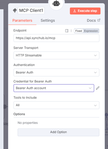 You will then be taken to the configuration window for the Tool node. In the Endpoint box paste in `https://api.synchub.io/mcp`. Server Transport must be `HTTP Streamable` and Authorization must be set to `Bearer Auth`: