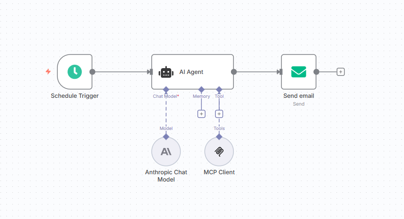 n8n workflows can connect to the SyncHub MCP server to retrieve data from your warehouse. Below is a simple example of a workflow which retrieves a basic data insight on a daily schedule and emails the result to a recipient:
