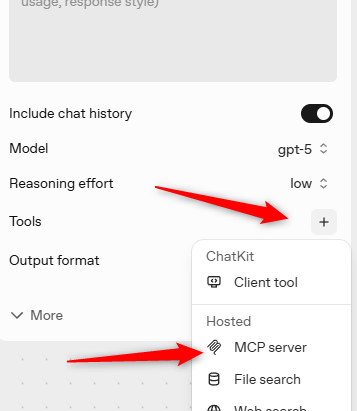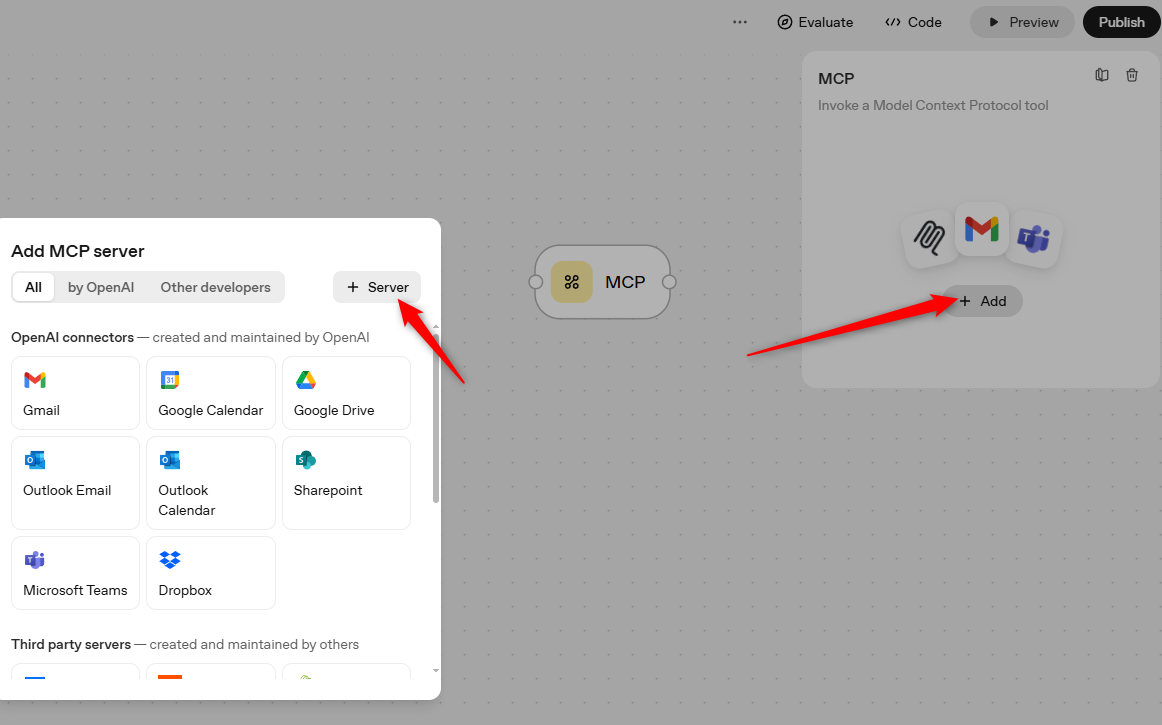 In order to set up an MCP node select MCP from the list and click on the newly created node. This will open the configuration window. Click the `+add` button and then the `+server` button in the new window. This will allow you to configure access to a remote MCP server: