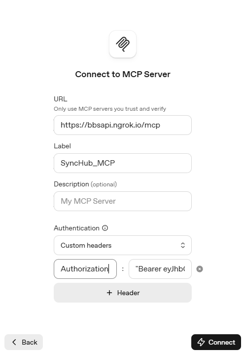 In the configuration window paste in `https://api.synchub.io/mcp` for the URL, `SyncHub_MCP` (or similar) for the label and select Custom headers for the authentication method. The header must be "Authorization" and value is "Bearer YOURTOKEN", where YOURTOKEN should be replaced with the one you created earlier. It is **critical** that the value entered has quotation marks around it: