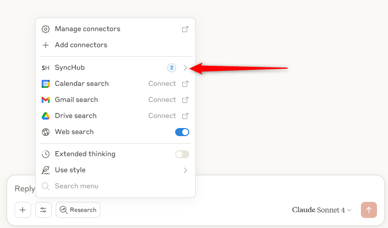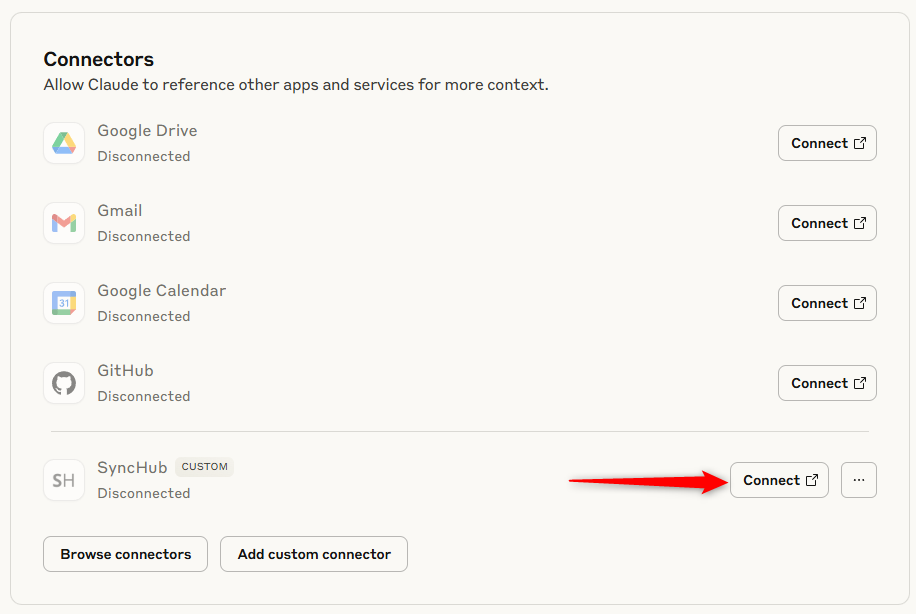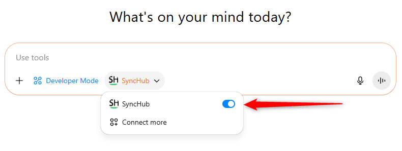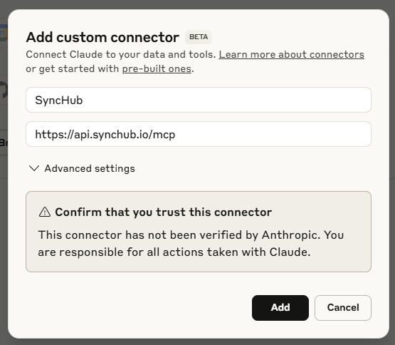 First, you'll need the address of our MCP server: **https://api.synchub.io/mcp**