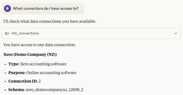 You'll note the (2) indicating that tools that are available for Claude to use. Let's try a couple of them out now. First, I'll ask what connections I have access to (you wouldn't generally ask this yourself, but we're just going to demonstrate that Claude knows):